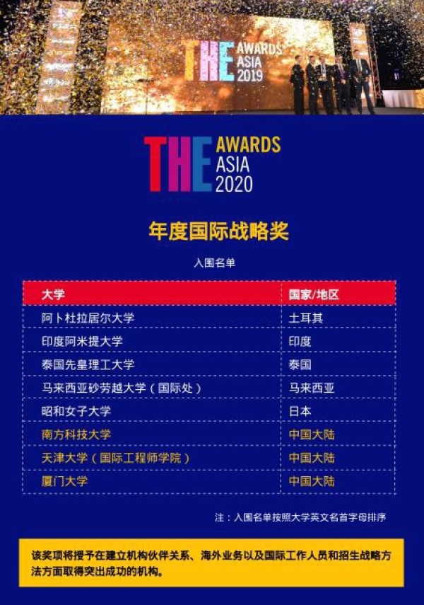 拥有高等教育界的奥斯卡美誉的泰晤士高等教育大奖(THE Awards)作为英国高等教育界的里程碑已经有14年的历史。此次泰晤士高等教育亚洲大奖共设立10个奖项,年度国际战略奖是授予在建立机构合作伙伴关系、海外业务及国际工作人员和招生战略方法方面取得突出成功的机构。