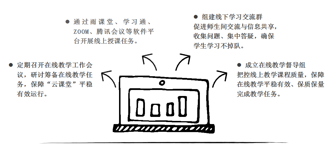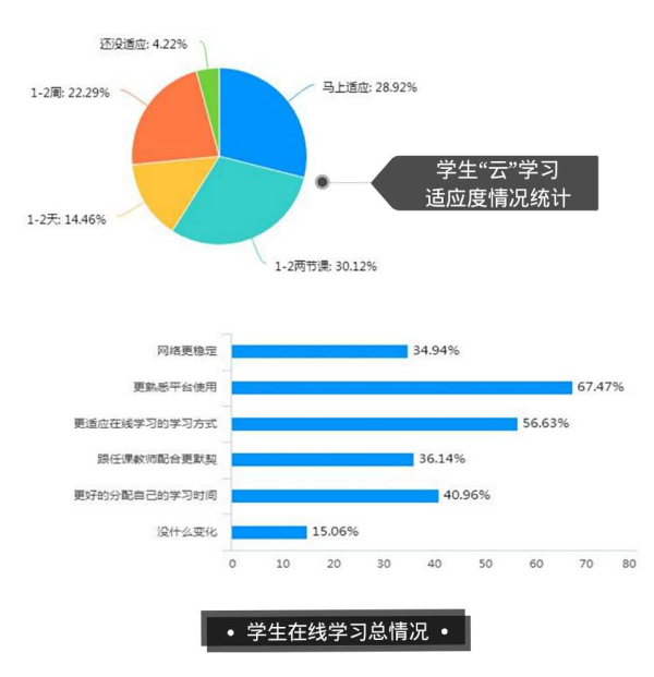 通过同学们前四周“云课堂”学习体验的情况反馈,大部分同学表示已经适应“云课堂”新颖的学习方式,不仅对教学平台的使用更加熟悉,而且也能够合理安排好时间,学习更积极、更充实。多数任课教师采用线上线下相结合的教学方式,增设互动、测试等环节,使得在线教学方式不断优化,保障“云课堂”在线教学质量。