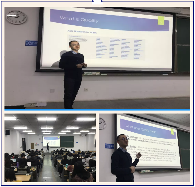 恩智浦公司李经理先通过两个视频简单介绍恩智浦公司,并结合自身多年的质量管理工作经验,从“什么是质量、为什么进行质量管理、怎样进行质量管理、产品质量管理、汽车质量管理要求”等方面为同学们讲述了企业质量管理和恩智浦公司的质量文化,开启了同学们对企业质量管理的全新认知——质量服务于产品。讲座结束后,李经理针对同学们提出的质量管理相关问题进行一一解答。