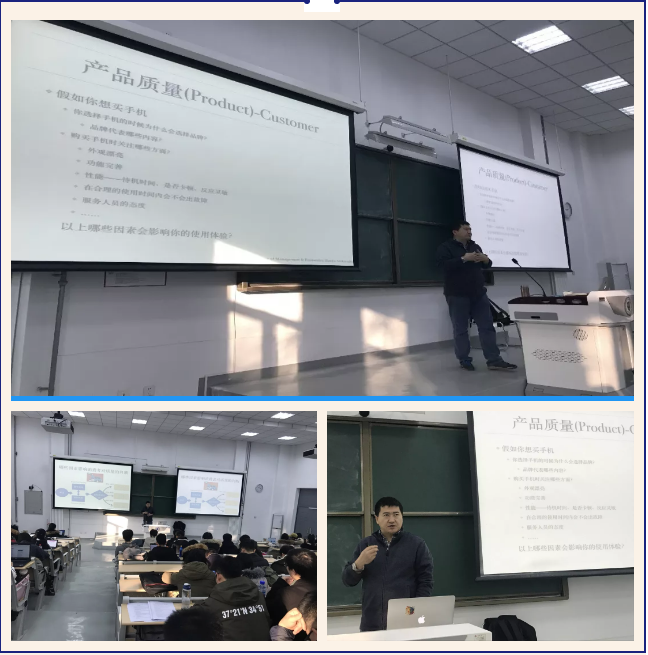 何教授给同学们带来现代质量管理理论与方法课程。何教授用多年的教学管理经验,结合同学们息息相关的日常生活,如:如何选择一部手机,餐厅用餐以及酒店住宿等,深入浅出的从质量的基本概念、如何进行质量管理、常用的质量工具以及质量体系等四个方面给同学们带来一节生动活泼的质量管理课。