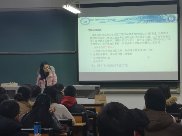 12月26日,为使我院18级学生更加充分了解赴法国参加工程师阶段实习项目的各类事项,国际工程师学院于天津大学卫津路校区26教B415室举办18级学生赴法国参与阶段实习的说明会。我院外事秘书张小娟、宣传秘书刘英彤、17级计算机专业学生张富祥以及全体18级学生出席本次说明会。