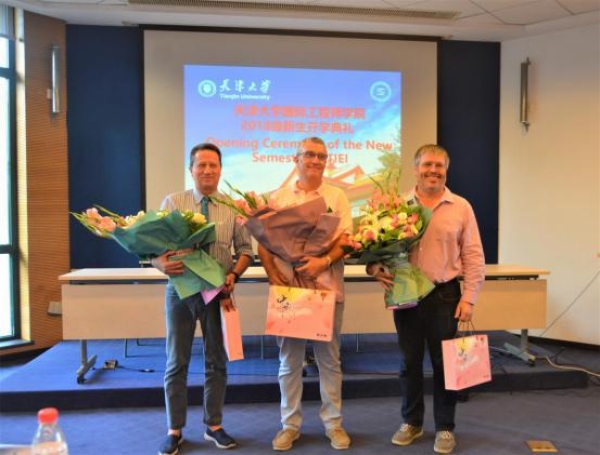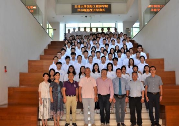 (本站讯刘英彤)2018年9月9日,喜逢教师节来临之际,天津大学国际工程师学院于天津大学卫津路校区会议楼第八会议室举行2018级新生开学典礼。求是学部党委书记单小麟、国际工程师学院院长陈冠益、国际工程师学院副院长关静、求是学部副主任王玮、求是学部副主任于倩、法国尼斯综合理工学院前副校长Philippe LORENZINI、尼斯综合理工学院国际办公室负责人MARC Gaetano、尼斯综合理工学院教师代表GILLES Jacquemod、国际工程师学院智能建筑专业负责人刘刚出席本次开学典礼。国际工程师学院管理教师团队以及学院全体2018级新生参加典礼。典礼由学院18级新生采用中、英文双语主持,并在庄重的国歌声中拉开序幕。