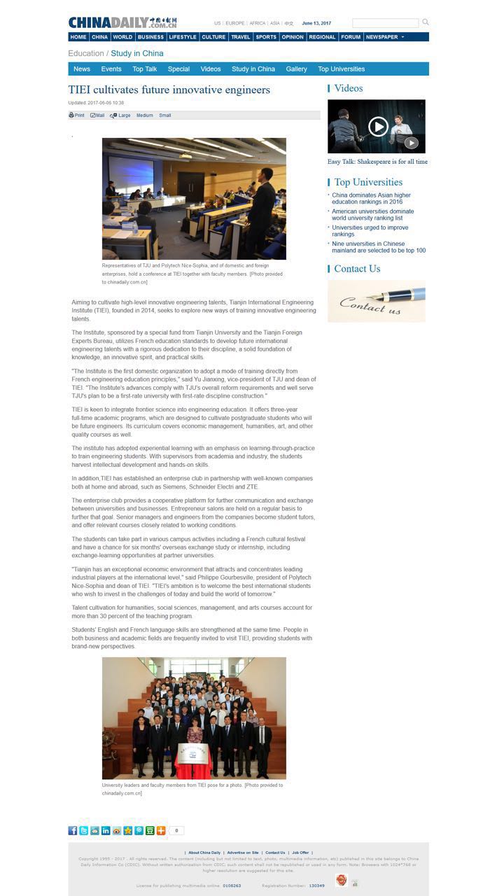 6月6日,中国日报网刊登报道国际工程师学院题名为“TIEI cultivates future innovative engineers”的文章。国际工程师学院成立于2014年5月,是与法国尼斯综合理工学院合作办学,旨在成为“开放式、国际化、创新型”的一流国际工程师学院。学院目前设有电子信息、计算机及智能建筑三个专业。学院按照法国工程师培养模式,结合企业对工程人才的需求,在教学改革、校企合作等方面进行积极的探索。并充分利用国际教育资源,加强与政府、企业的合作联系,不断提高学院师资配备、教学水平、教学条件、学生就业等方面质量。在夯实学生数理基础的同时,加强学生人文素养、管理能力以及工程实践创新能力的培养,使之成为推动未来世界工程科技进步的复合型国际工程领军人才。