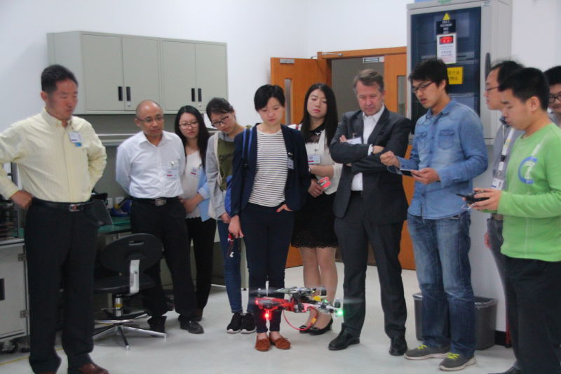 研发中心微控制器部门亚洲运营高级经理郑总经理、微控制器实验室经理邵经理和模拟部门应用部门经理乔经理带领大家走进微控制器部门的实验室和模拟部门实验室,介绍了科研团队正在攻关的产品,现场演示,学生代表认真观摩,Philippe Gourbesville校长与研发中心的实习生进行交流。随后,在研发中心会议室举行座谈,郑总经理向学院代表介绍了研发中心的现状和研发情况,学生代表与实习生交流实习感受,双方还对今后的合作交流提出了建设性的构想和安排。