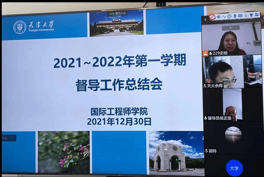 (通讯员 史杨)2021年12月30日上午,天津大学国际工程师学院2021-2022第一学期研究生教学督导工作总结会采用“云会议”形式顺利召开。学院副院长关静、督导组专家、专业负责人,研究生教务员出席会议。