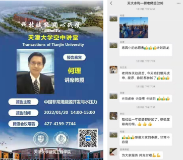 此外,何老师还积极参与“科技赋能,同心战役”天津大学空中讲堂等系列活动,丰富了我们校内学习生活安排,并在全校范围内产生了非常好的反响和效果。