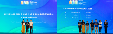在持续7天的比赛角逐里,经过导师和同学们对细节的日夜反复推敲打磨,对实时数据的深刻理解与运用,及在竞赛现场对实际落地精度的严格把控下,以满分的成绩荣获四项子竞赛“室内环境”、“能源自给”、“清洁取暖/制冷”、“48小时零能耗挑战”第一名。荣获子竞赛“工程建造”、“能源能效”、“建筑设计”、“宣传推广”、“互动体验”第一名,“市场潜力”第二名,“最受媒体欢迎奖”第一名以及“三项挑战”的“最具智慧互联创新奖”。