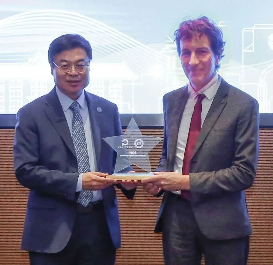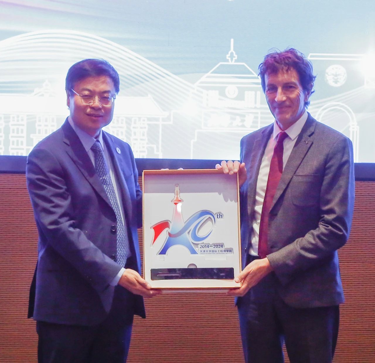 法国尼斯索菲亚综合理工学院校长Alexandre CAMINADA对天津大学国际工程师学院成立十周年表示祝贺。他回顾了双方十年来的合作历程,肯定了国际工程师学院在人才培养和学术交流等多方面取得的成果。他表示对未来双方间的合作及发展充满信心,期待双方继续携手并进,共同推动中法工程教育事业发展。随后,金东寒校长与Alexandre校长互换了象征着双方院校友谊与发展的纪念品。