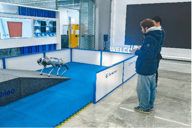 在实操体验环节,中、法学生协作,通过遥控器控制机器狗完成行走、避障、姿态调整等任务,亲身体验“代码如何赋予机器生命”。