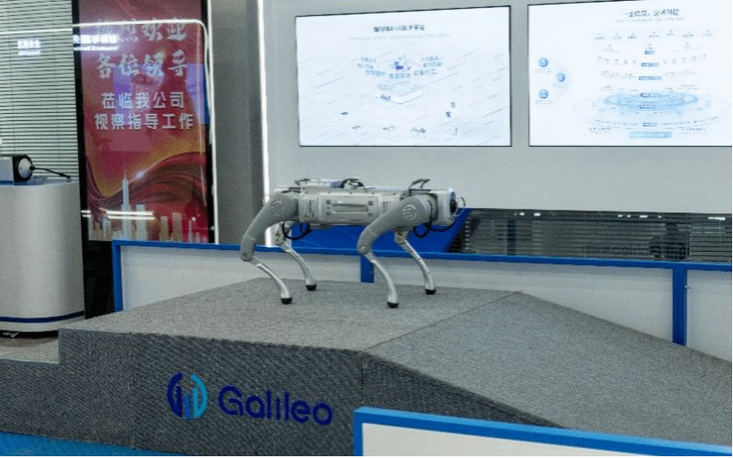 在展厅,伽利略(天津)技术有限公司高级工程师张昂博士,向师生们展示了公司核心产品—智能仿生四足机器人C1。张博士全英文讲解其设计思路及功能,并展示了机器人前进、爬楼梯和下坡等行进姿态,展现出了该产品惊人的运动平衡能力与对环境的适应性。