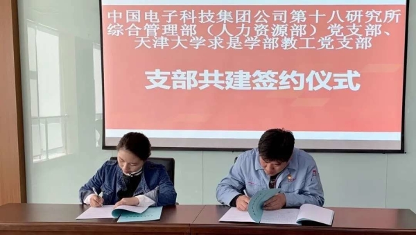 最后,天津大学求是学部教工党支部书记陈维与中国电子科技集团公司第十八研究所人力资源部(综合管理部)党支部书记盛彦华在全体参会人员的见证下,签订了党支部共建协议,标志着双方党支部达成合作,将共同引导大学生走与实践相结合的成才之路,帮助大学生在实践中受教育、长才干、做贡献,增强大学生实际分析问题和解决问题的能力,培养具有家国情怀、全球视野、创新精神和实践能力的卓越人才。