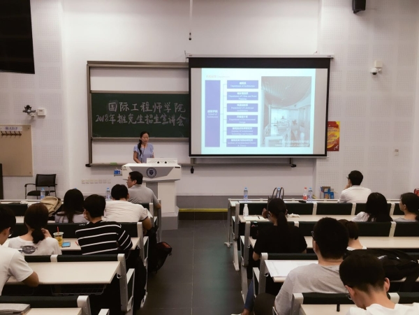 首先,国际工程师学院教学副院长喻梅从学院的发展历程、办学模式、法国职衔委员会(CTI)对学院的国际权威性认证、学院整体师资水平、“1+2+3+4”独特的培养体系、学生培养成果、学院今后发展规划以及学院招生情况等多方面向与会人员进行详细介绍。充分体现了学院高水平、国际化的办学特色以及优越的发展前景。除此之外,副院长喻梅向与会人员特别强调了国际工程师学院获得的法国职衔委员会(CTI)授权颁发的法国工程师文凭的含金量。她表示学院能够为学生提供更多国际交流以及接触企业的机会,充分培养锻炼学生的创新实践能力。最后,对参加本次推免生招生宣讲会的同学表示感谢与欢迎。