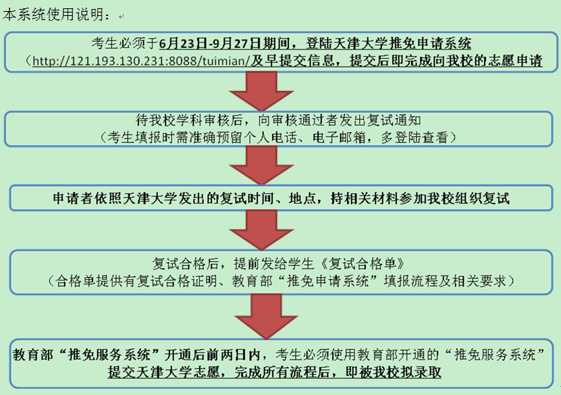 该系统仅为天津大学接收推免生的辅助系统,用于前期复试信息采集,待教育部“推免服务系统”开通后前两日内,考生必须使用教育部开通的“推免服务系统”提交天津大学志愿,完成最终录取。